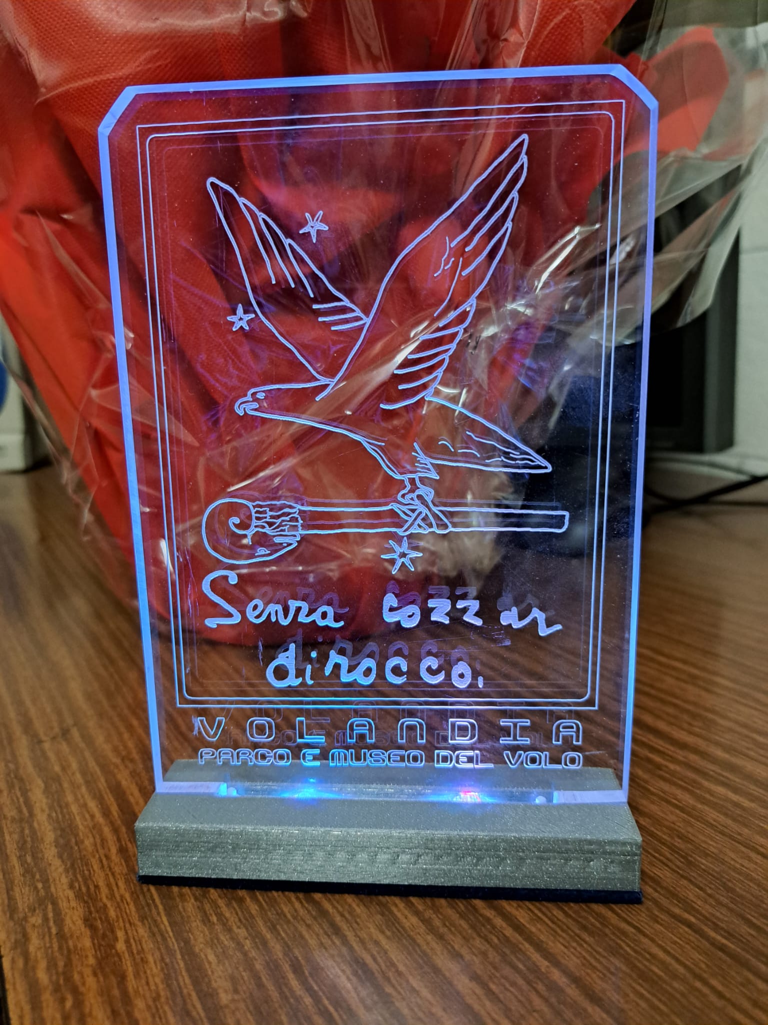 La Sig.ra Rossella ci ha omaggiati di un bellissimo distintivo di Volandia con il motto delle ex officine Caproni “Senza cozzar dirocco” : questo motto era stato coniato da Gabriele D’Annunzio e si puo’ tradurre come “senza attaccare da terra (cozzar), colpivano gli obiettivi (dirocco) dal cielo”