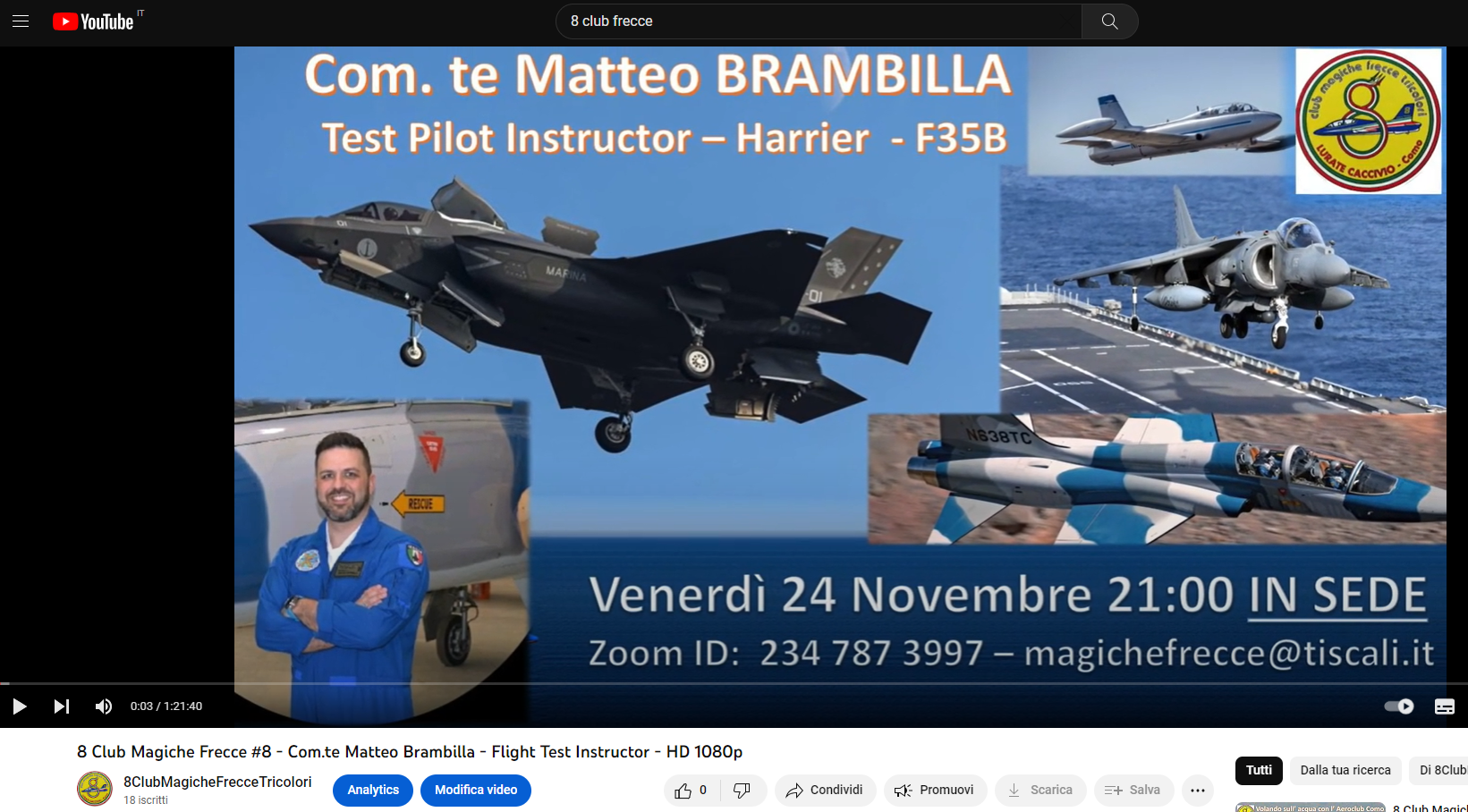 E’ online su Youtube l’interessante e rara intervista realizzata dall’8 Club Magiche Frecce al Comandante Matteo Brambilla: piu’ di un’ora incollati ad ascoltare la sua storia, la passione per la Marina Militare e soprattutto l’approccio con l’Harrier e la transizione su F35B🙂