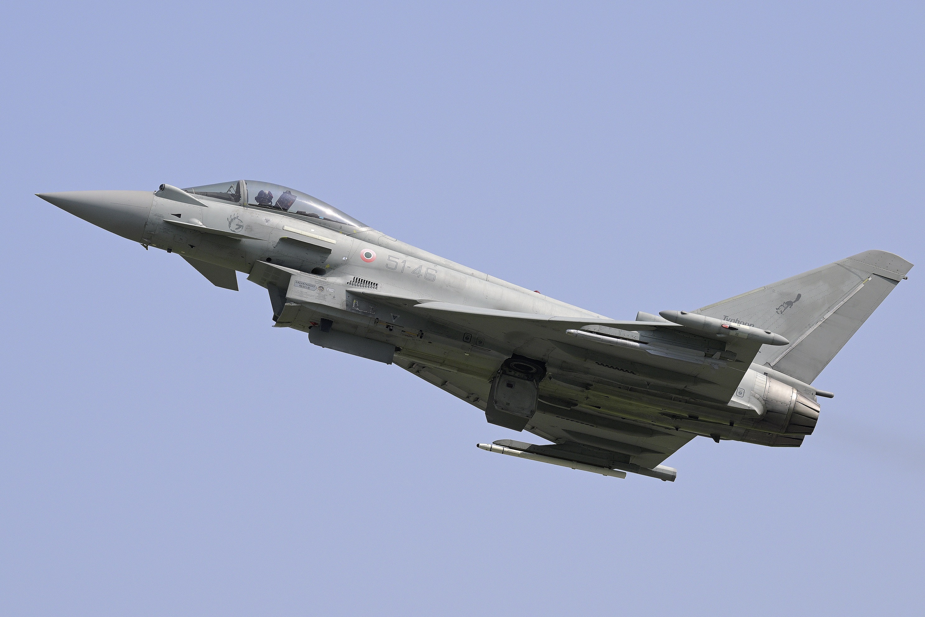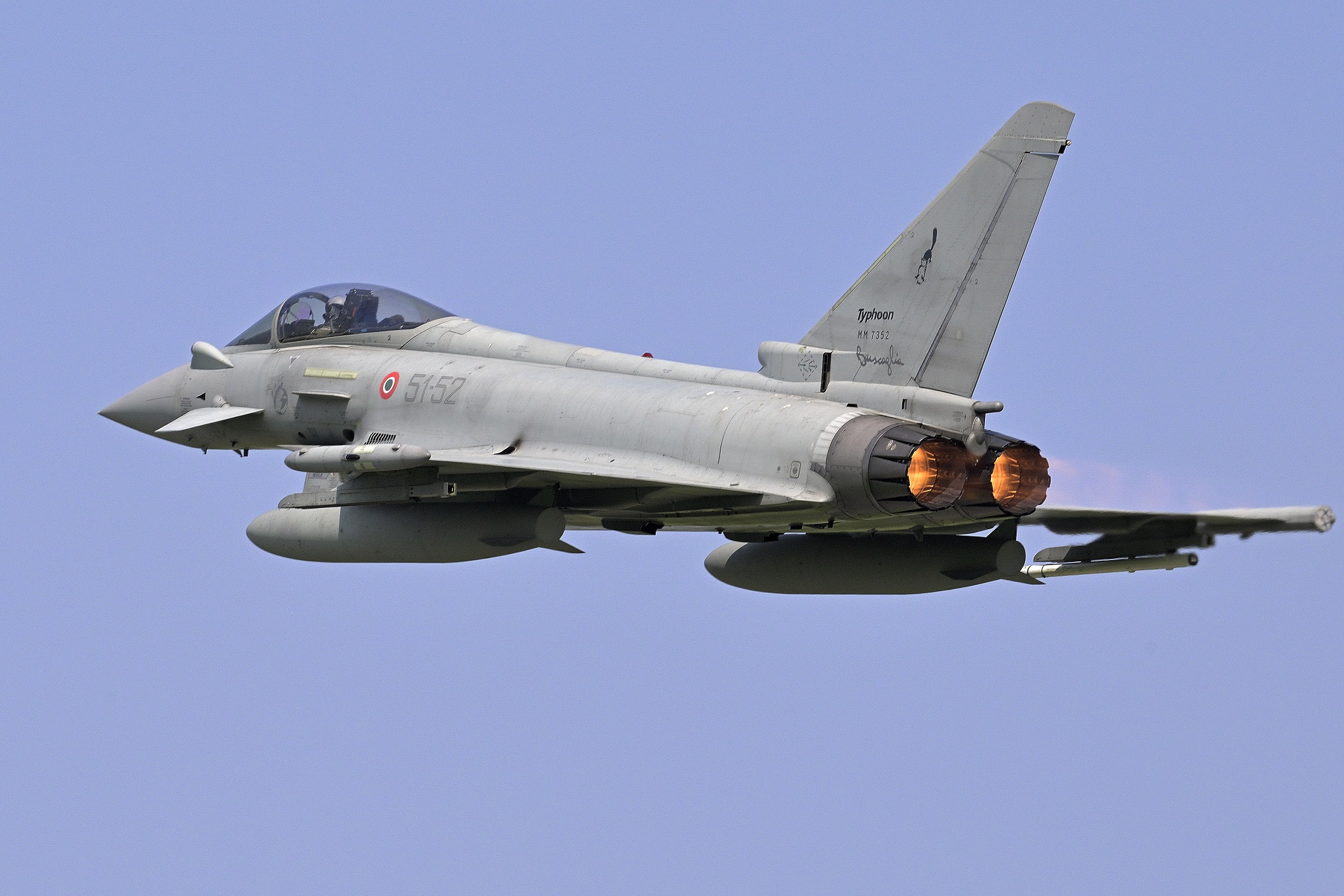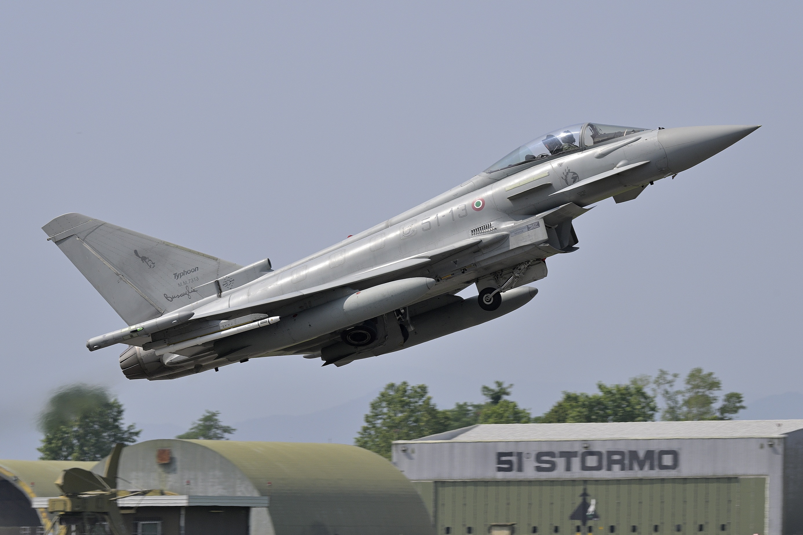 La posizione di ripresa è ottima, ed ecco che arrivano per un passaggio basso due F16 dei Triple Nickel, che nel corso della giornata passeranno altre due volte. E’ poi la volta del decollo del primo Typhoon, che stacca proprio di fronte a noi e si esibisce in una vertiginosa arrampicata verticale a full ab!
