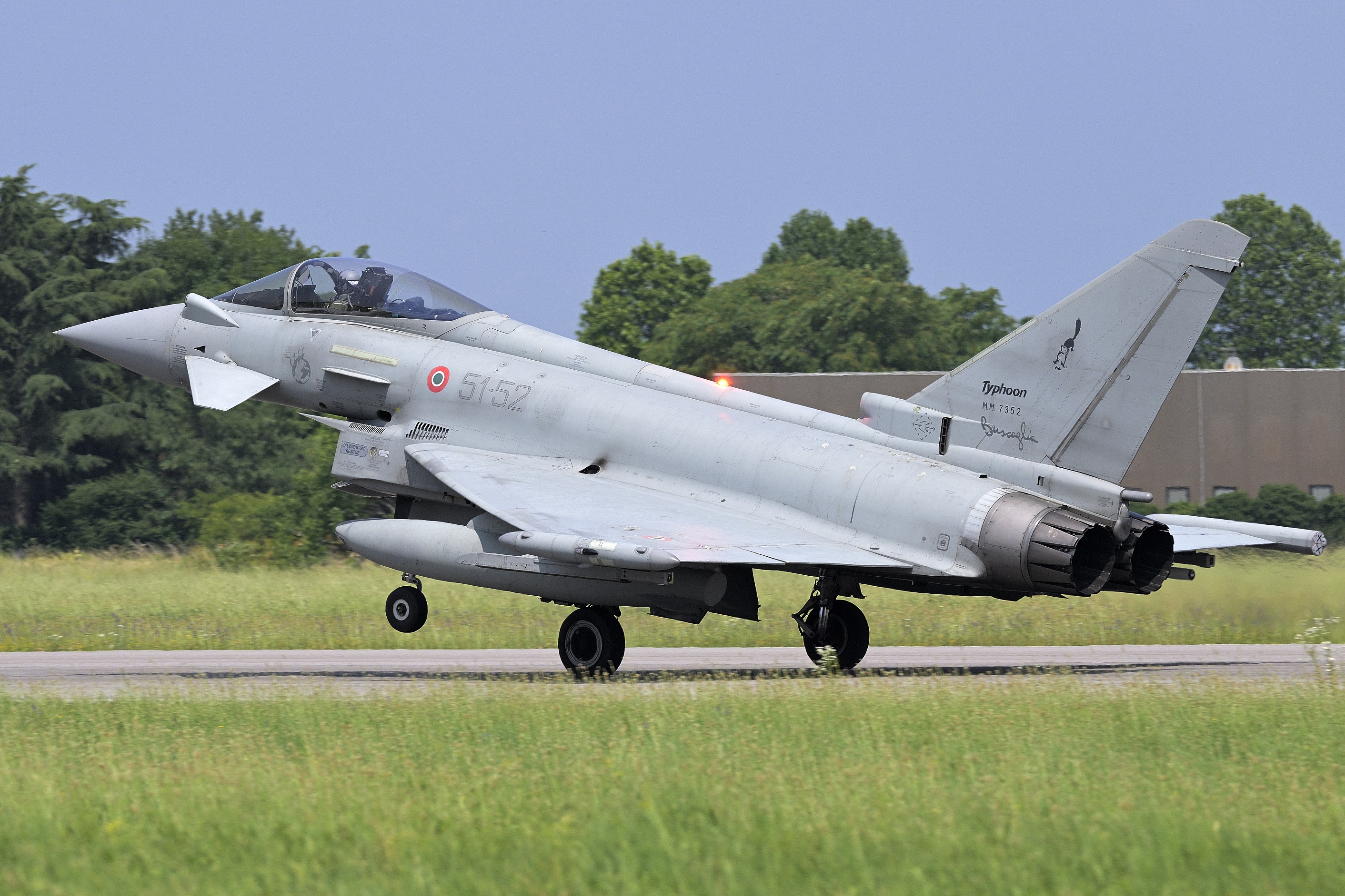 L’ultimo Efa prima di atterrare per la 08 ci diverte con un passaggio basso ed un finto atterraggio con richiamata finale con il carrello fuori. Tra una missione e l’altra arriva all’atterraggio un AB412 dei Carabinieri forestali, che percorre a bassa quota tutto l’asse della pista prima di atterrare.